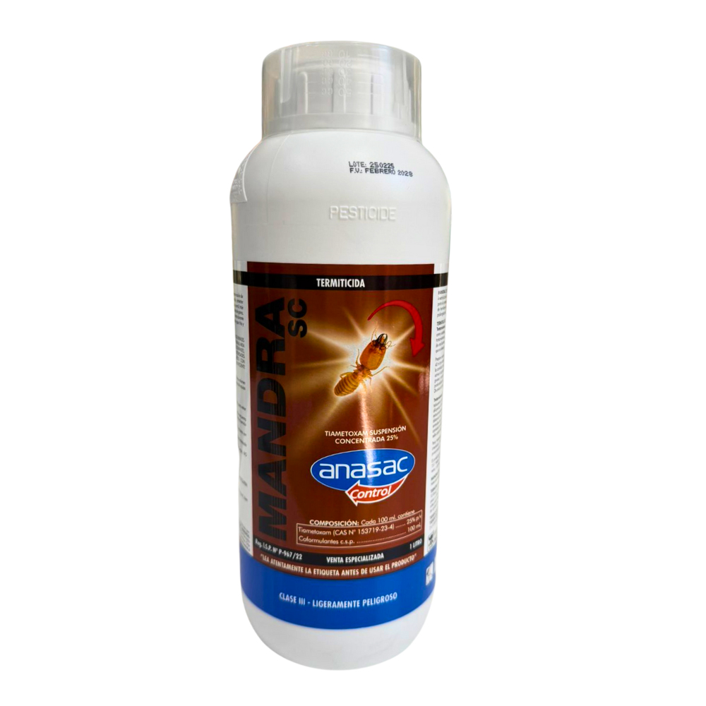 El Insecticida MANDRA es un producto líquido de alta eficacia, formulado con Tiametoxam 25% p/v, un neonicotinoide de segunda generación que ofrece acción rápida y un excelente control residual. Es ideal para el manejo profesional de termitas subterráneas y de la madera, escarabajos xilófagos, hormigas, cucarachas, moscas, pulgas, grillos, pescadito de plata, ciempiés y milpiés. Actúa por contacto e ingestión, generando un efecto dominó dentro de la colonia gracias a la trofalaxia y necrofagia, lo que permite un control más profundo y prolongado.