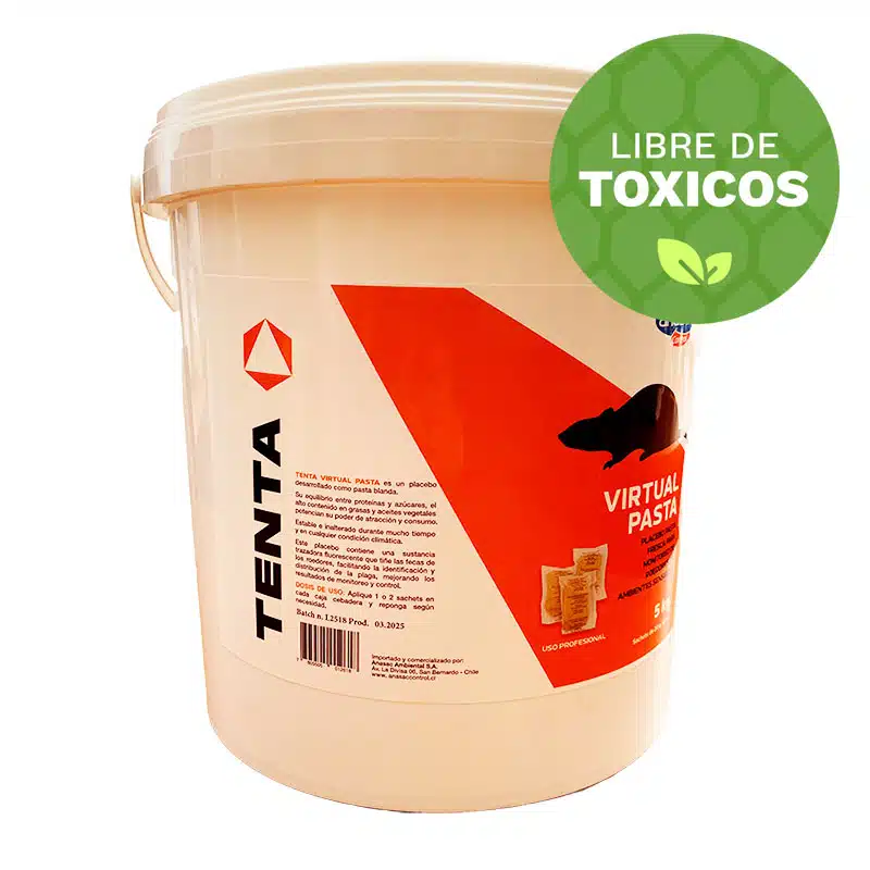 El Placebo atrayente Tenta Virtual Pasta es un cebo en pasta placebo de 5 KG con cebos de 20 G. formulado con un gran contenido de granos, aceites y grasas, libre de alérgenos y tóxico. Su componente fluorescente permite que, al iluminar excrementos con luz UV-A, estos emitan un color fosforescente, optimizando la identificación de rutas, especies y refugios de roedores sin añadir tóxicos.